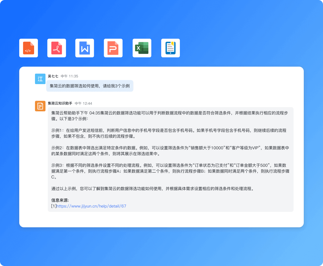 AI语言模型往往无法回答专业知识,比如您的产品知识,业务知识,论文,电子书等。灵犀API支持上传多种格式的知识文件,赋予AI语言模型您的专业知识。可用于企业内部/外部的知识助手。